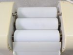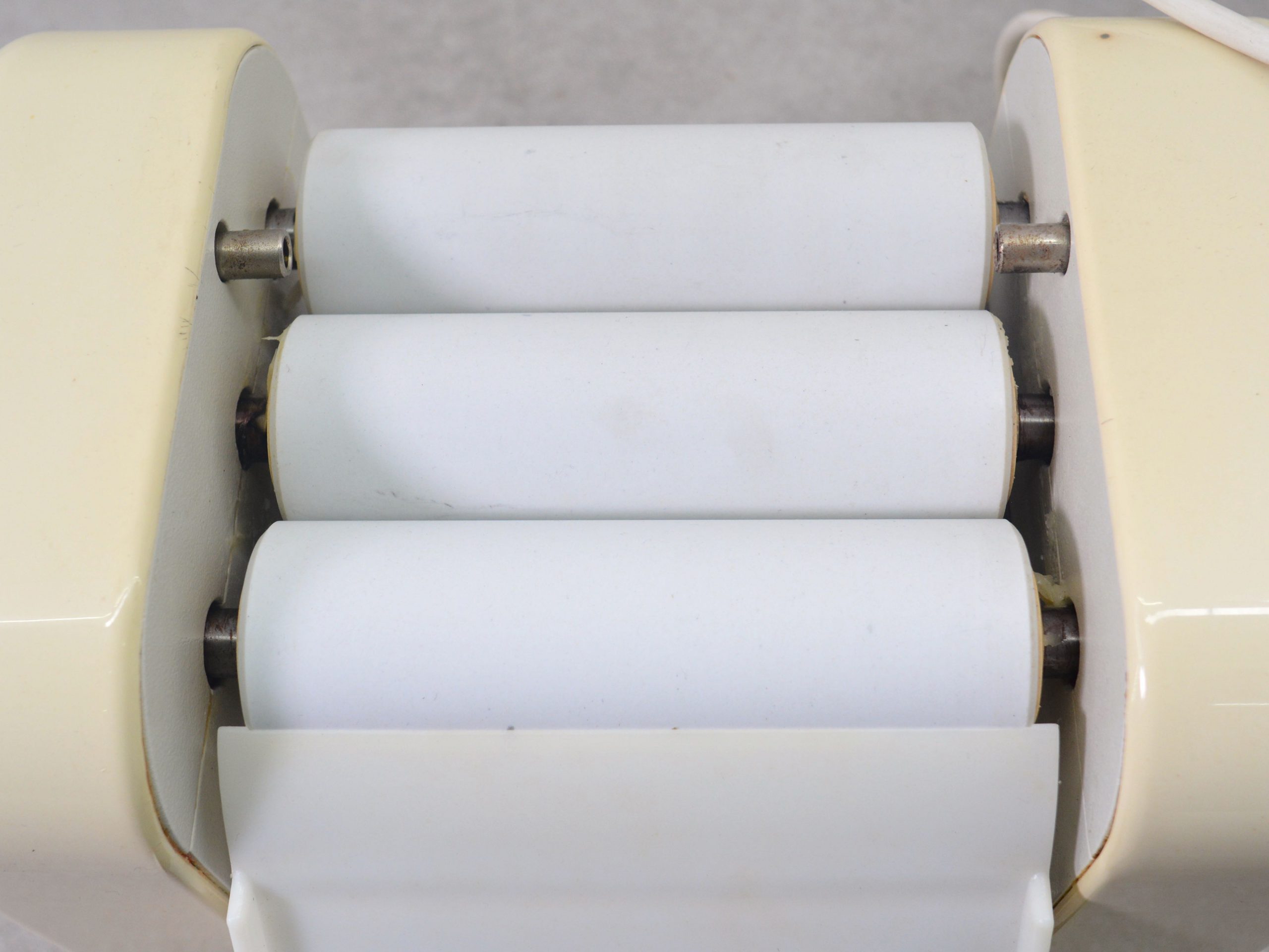 Diese Salbenmühle besteht aus drei Rollen. Der Abstand zwischen diesen Rollen ist manuell einstellbar. Die Salben, die Cremes und der Farbstoff werden zwischen den Walzen gedreht, so dass Agglomerate (Klumpen) auseinandergezogen werden können. Je kleiner der Abstand zwischen den Rollen, desto feiner ist die Vorbereitung der Salben, Cremes oder Farbstoffe.