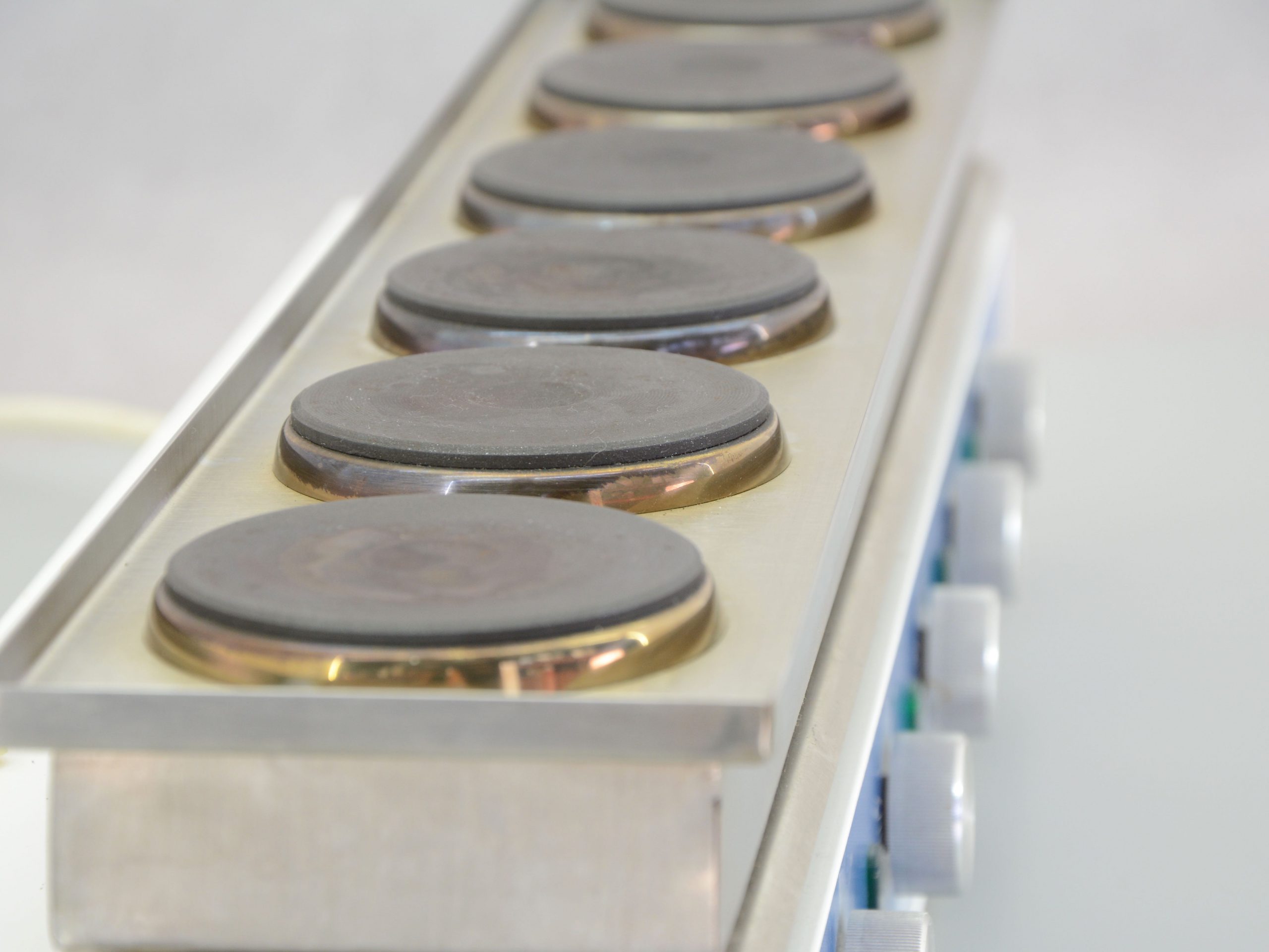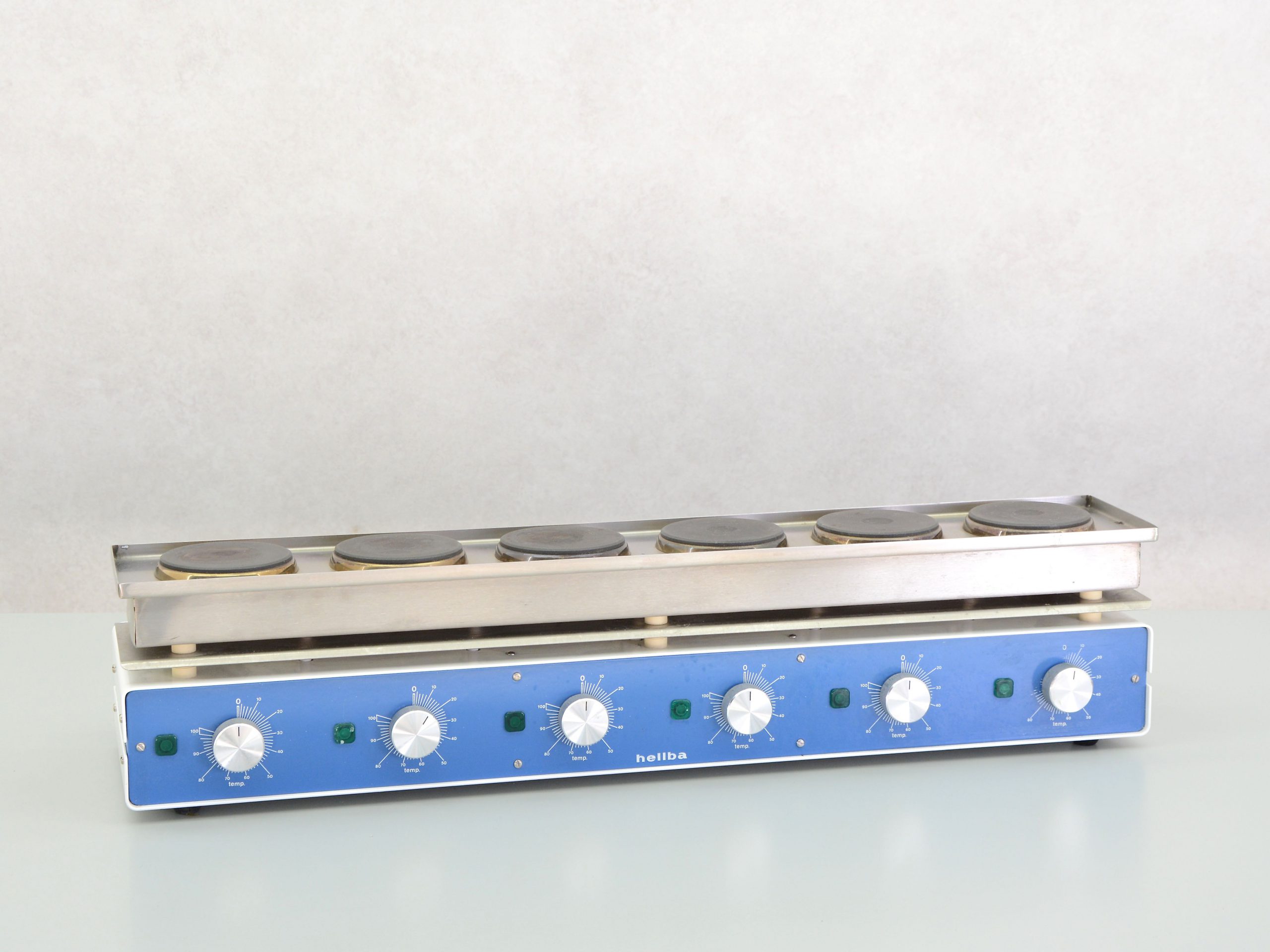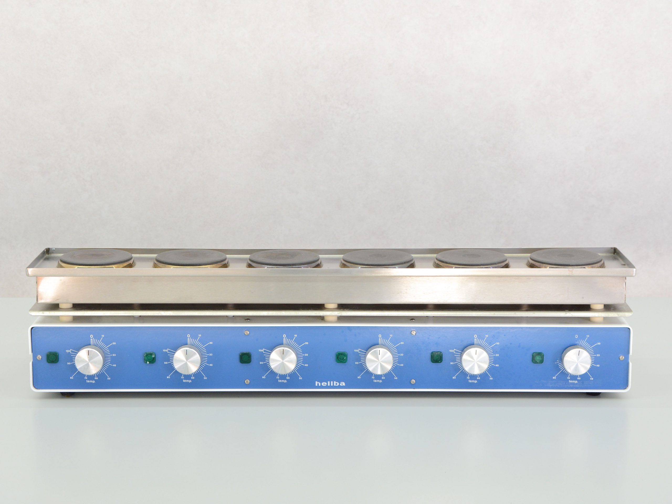 Die sechs Heizplatten der Marke Helba Typ OS6 eignen sich zum Erwärmen und Warmhalten verschiedener Materialien. JeHeizplatte hat einen eigenen Drehknopf zur Temperaturregelung.