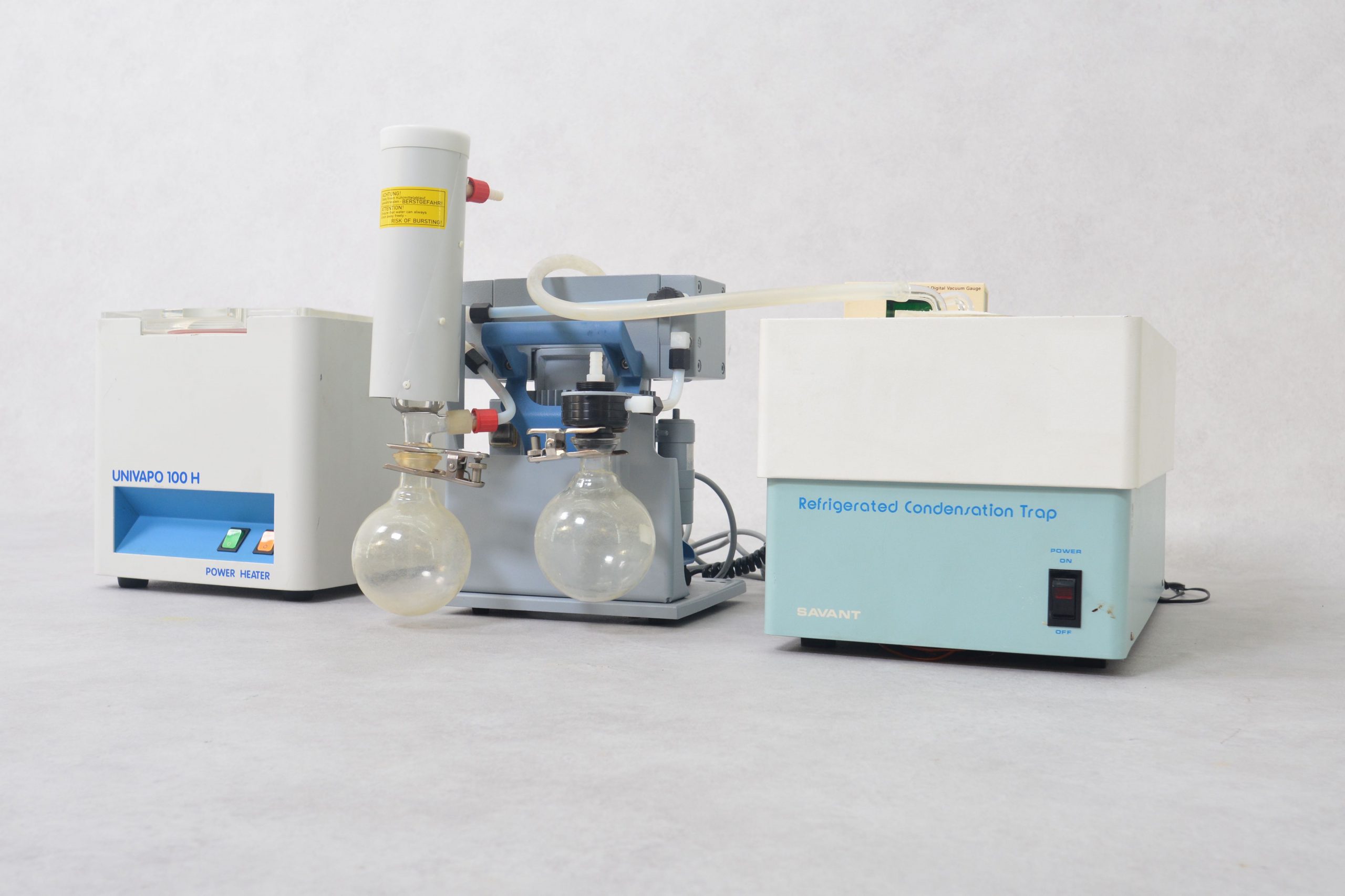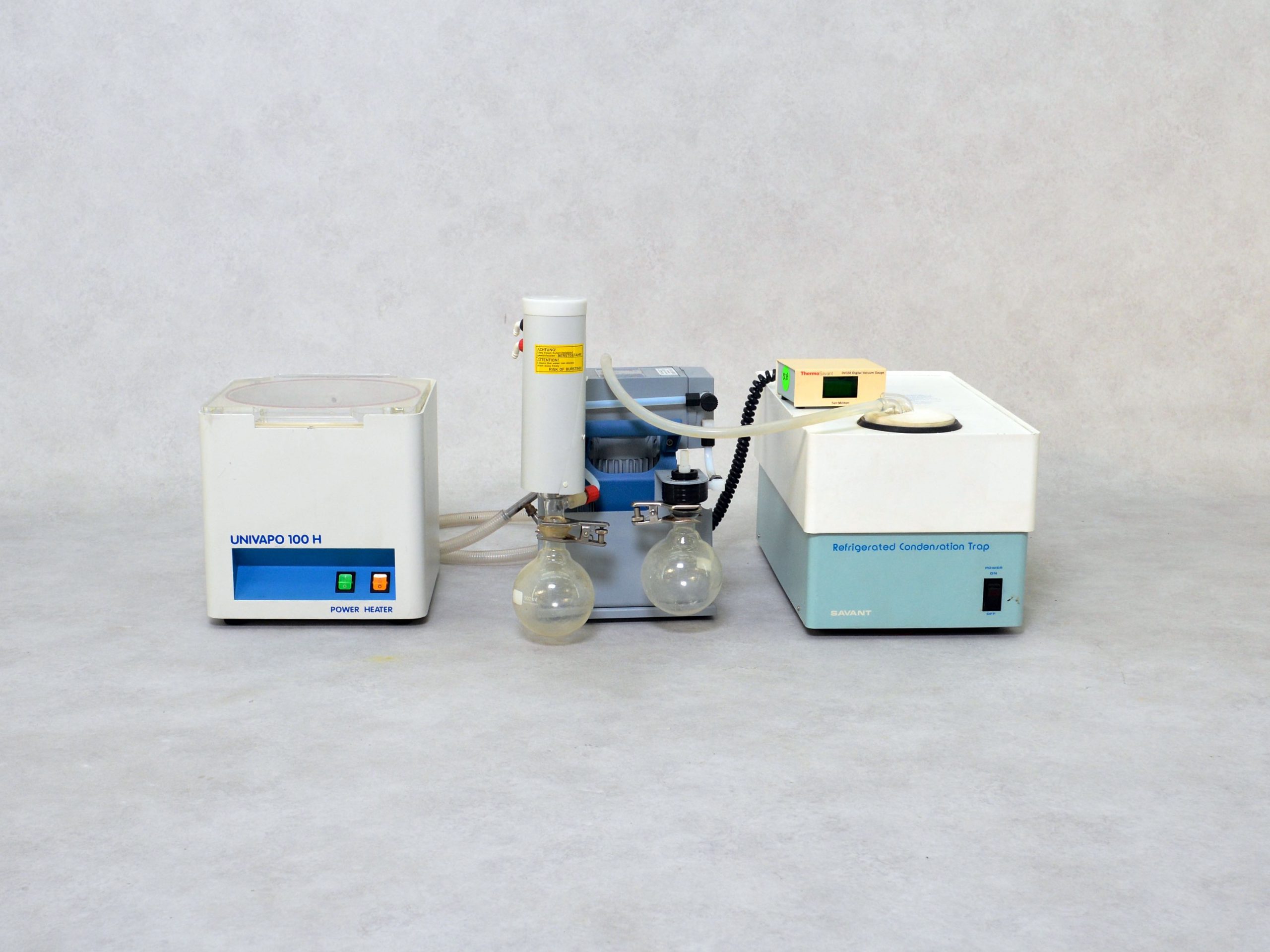 Die Refrigerated Vapor Trap der Marke Savant Typ RT-100A eignet sich hervorragend zum Schutz von Vakuumpumpen unter anderem in Gefriertrocknern, Öfen, Exsikkatoren, Zentrifugal- oder Rotationsverdampfern. Die Savant RT-100A Refrigerated Vapor Trap wird mit Vakuumpumpe und Zentrifuge geliefert.