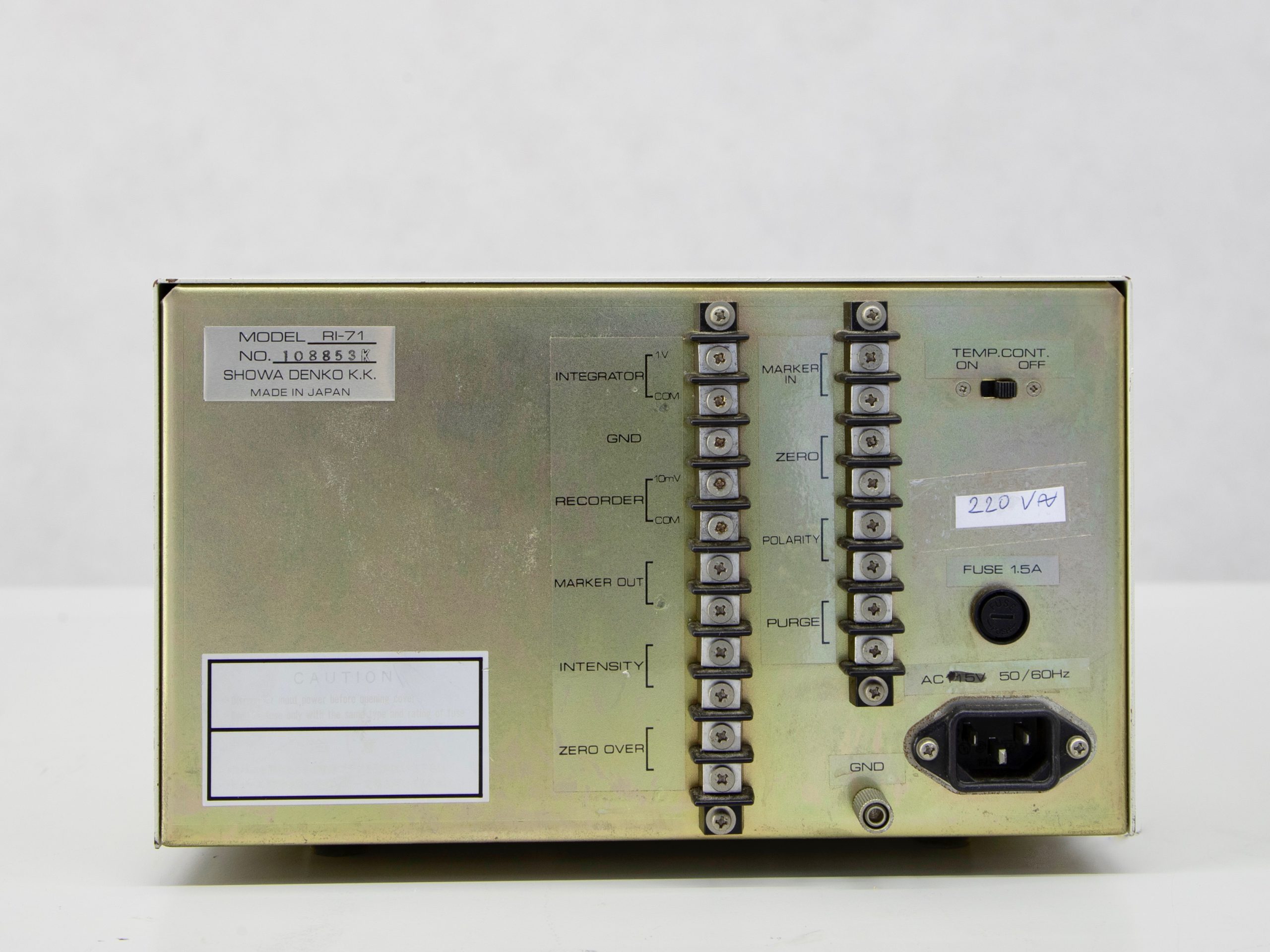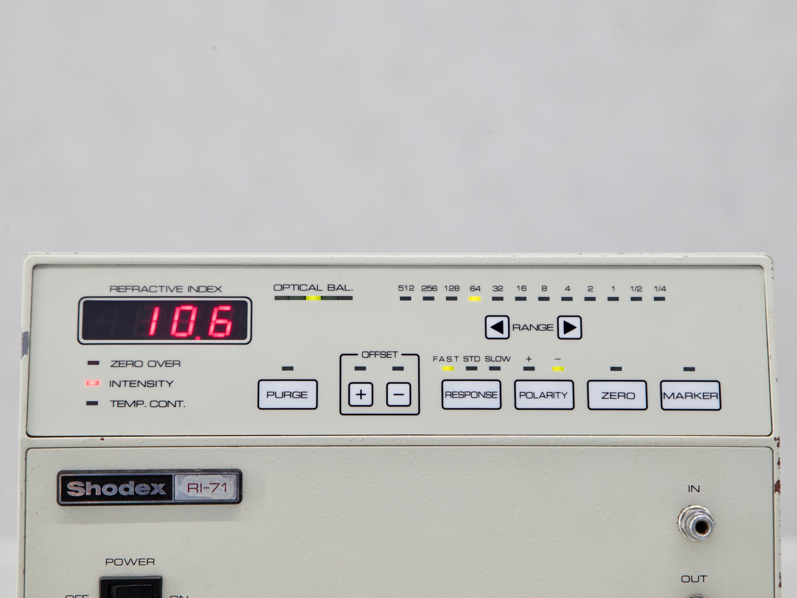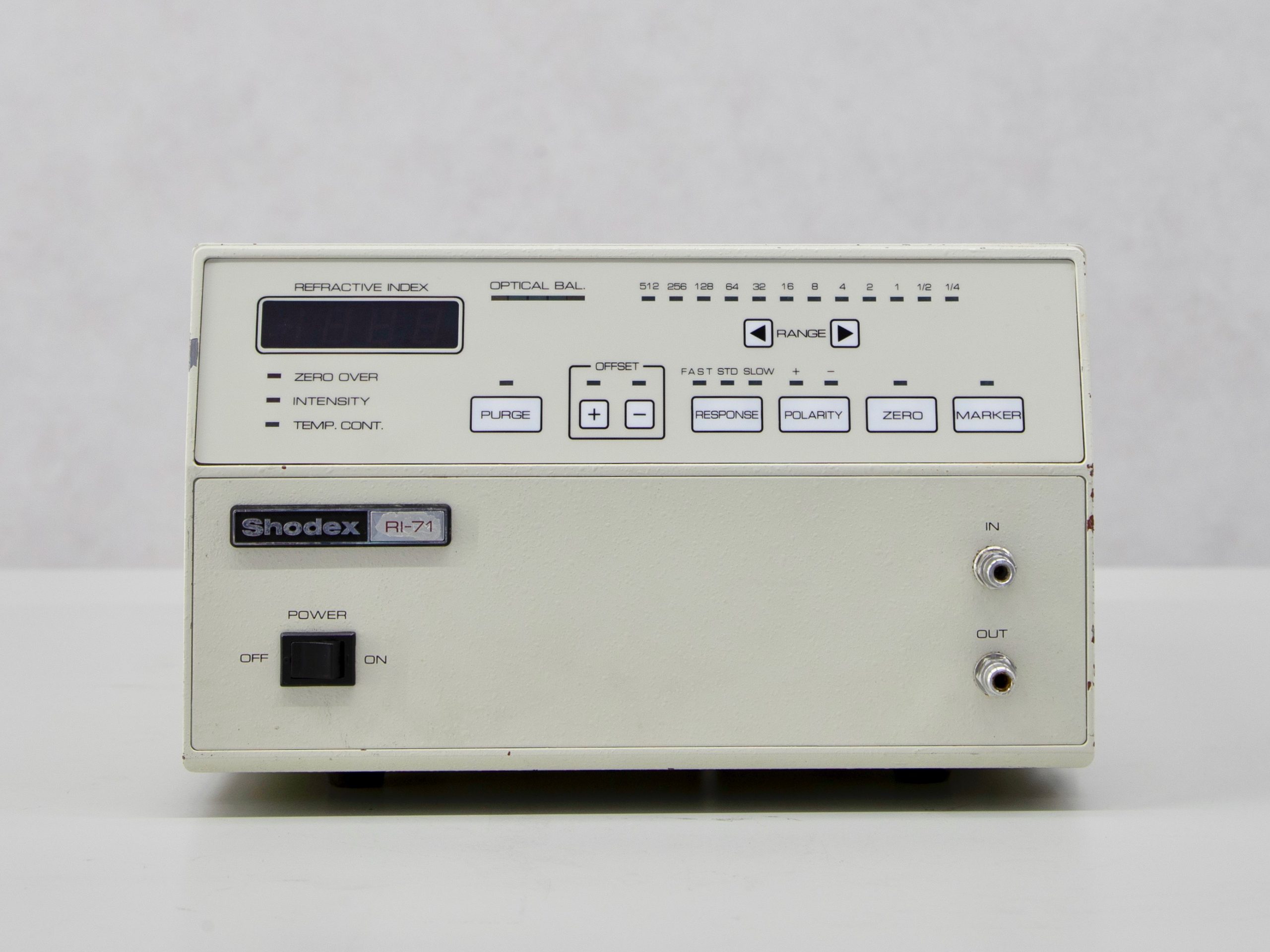 Der RI-Detektor der Marke Shodex RI71 dient zur Messung der Änderung des Brechungsindex des durch die Durchflusszelle fließenden Säulenabflusses. Der Shodex RI71 wird mit Hochleistungsflüssigchromatographen zum Nachweis von Substanzen mit begrenzter oder keiner UV-Absorption, nichtionischen und nicht fluoreszierenden Substanzen verwendet.